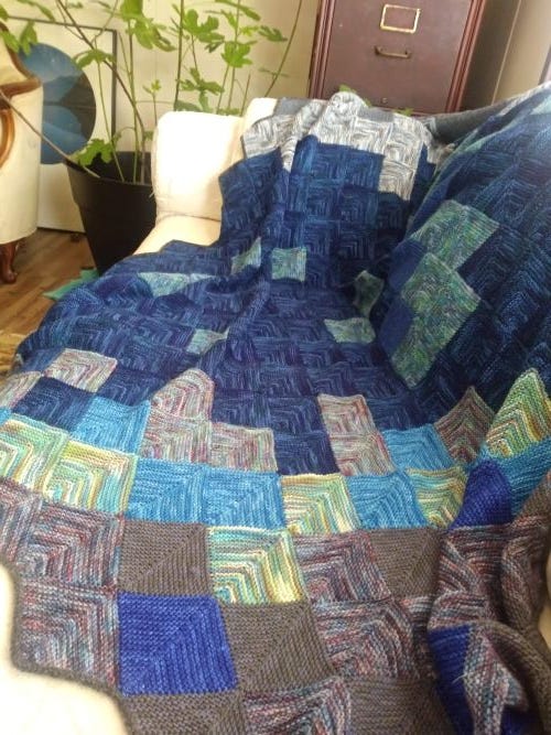I’d been wanting to knit up a sock yarn afghan for a while. These afghans use up the scraps from your old sock projects as you knit diamonds into a crazy quilt of memories.