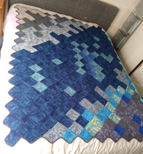 By the end of March, the squares were complete and the binding added. The piece was blocked and drying on the guest room bed and I stood back to view my triumph.